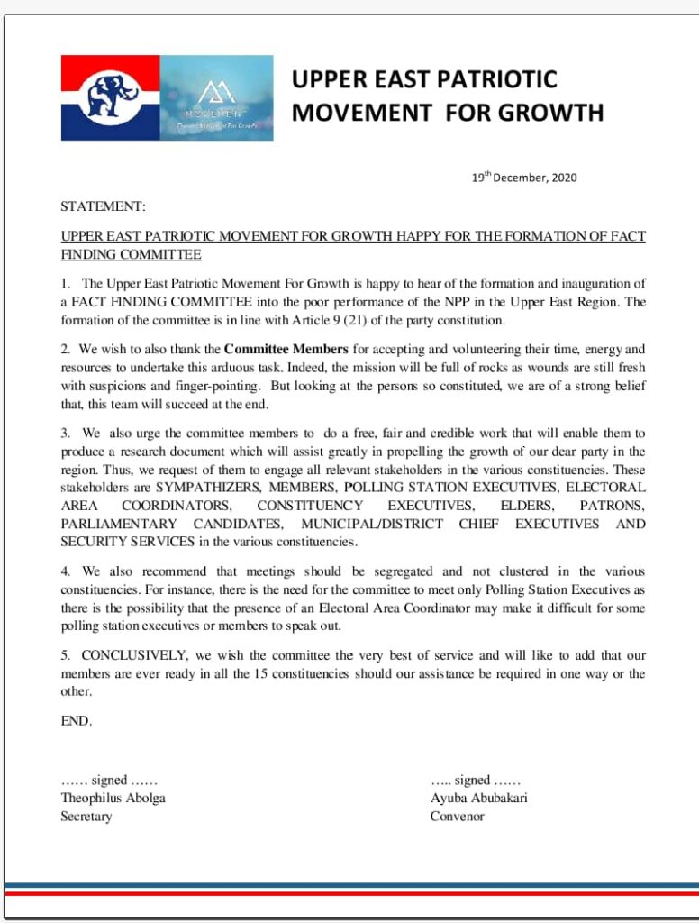 Upper East Patriotic Movement For Growth a Pro- New Patriotic Party group in the Upper East Region has expressed excitement upon hearing that, a FACT FINDING COMMITTEE members were inaugurated to look into what they described as poor performance of the governing New Patriotic Party (NPP). The group in a statement issued on December 19, 2020 captured by Apexnewsgh.com thanked the committee members for accepting and volunteering their time and resource to undertake such an important task on behalf of the party and its members in the Upper East Region. However, they are requesting the group to do a free, fair and credible work that will enable them produced a research document which will assist greatly in propelling the growth of their party in the region. Below is the statement: Apexnewsgh.com/Ghana Please contact Apexnewsgh.com on email apexnewsgh@gmail.com for your credible news publications
