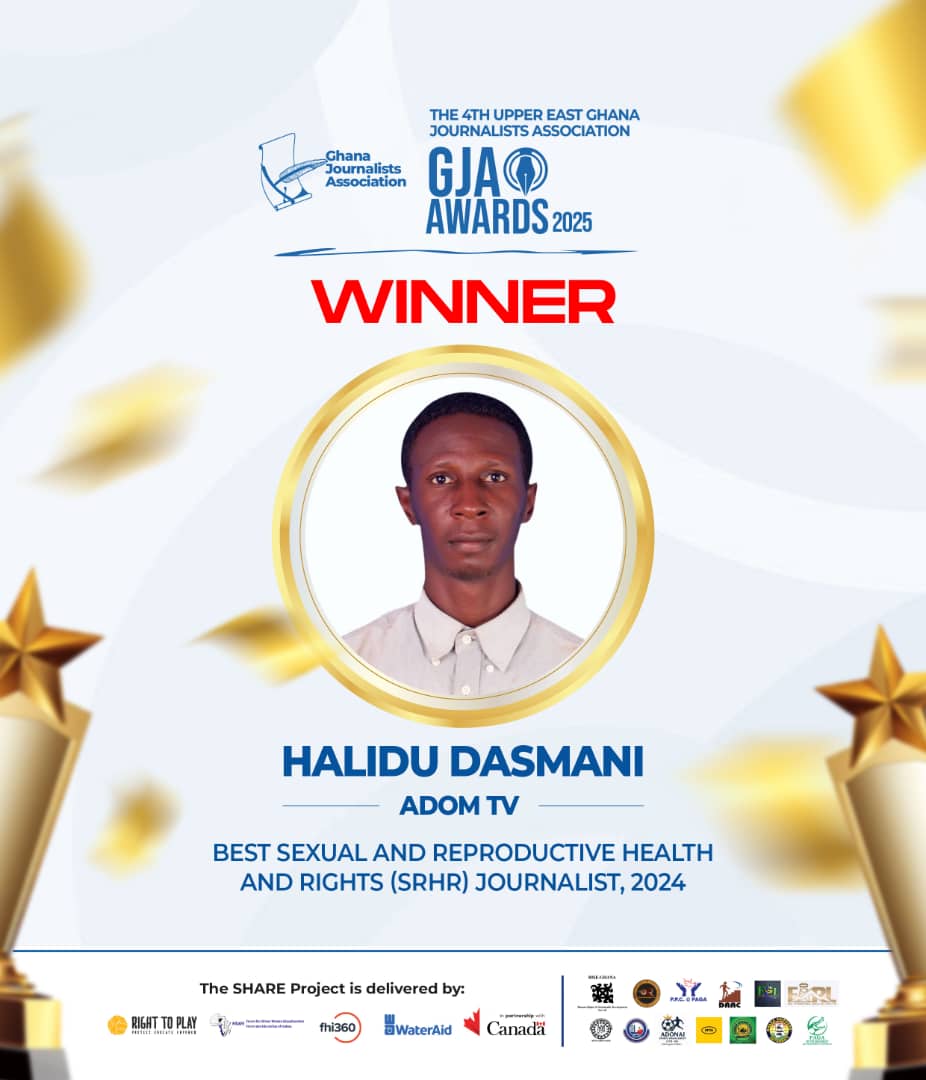 In a standout moment for impactful storytelling in Ghana’s Upper East Region, Halidu Dasmani of ADOM TV has been named the Best Sexual and Reproductive Health and Rights (SRHR) Journalist at the 4th Upper East Ghana Journalists Association (GJA) Awards 2025.