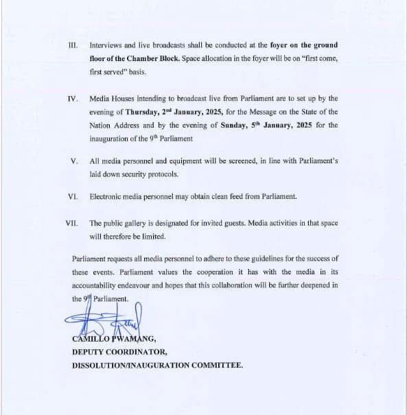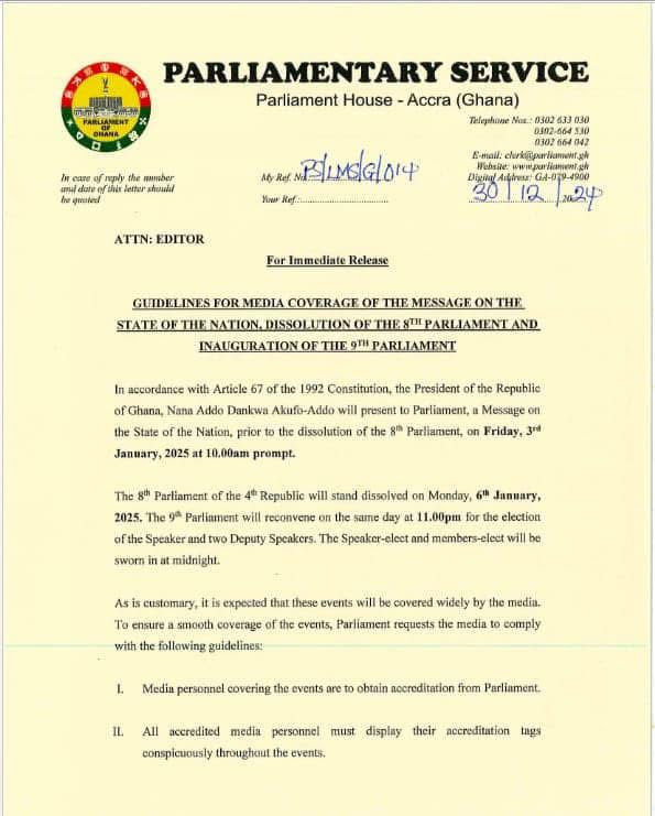 The address comes ahead of the dissolution of the 8th Parliament on Monday, January 6, 2025. On the same day, the 9th Parliament will convene at 11:00 PM to elect a Speaker and two Deputy Speakers. The Speaker-elect and newly elected Members of Parliament will be sworn in at midnight, marking the transition of the legislature to its next term.