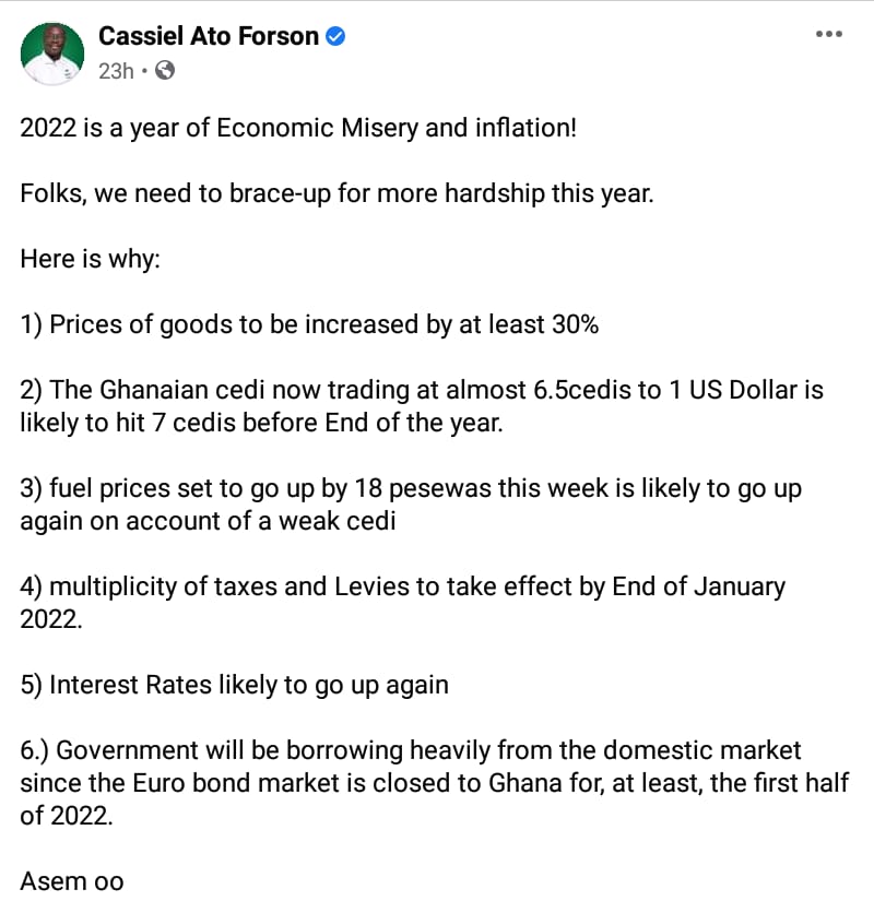 The Ranking Member on Finance in Parliament, Casiel Ato Forson, has prophesy that in 2022 Ghanaians will experience ‘Economic Misery and inflation’.