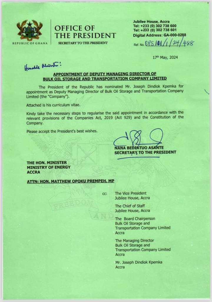 According to a statement signed by the Secretary to the President, Nana Bediauo Asante, dated May 17, 2024, President Akufo Addo has nominated Mr. Joseph Dindoik Kpemka for appointment as Deputy Managing Director of Bulk Oil Storage and Transportation Company Limited ¹.