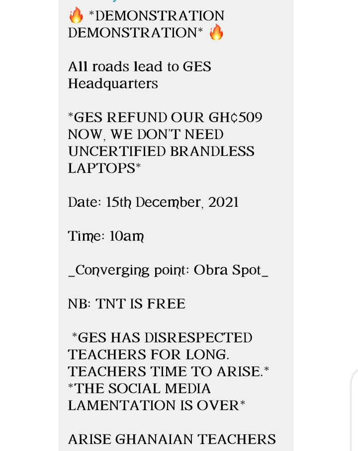 Part of the statement reads, “Demonstration Demonstration. All roads lead to GES headquarters. GES refund our GH¢509 now, we don’t need uncertified brandless laptops`.”