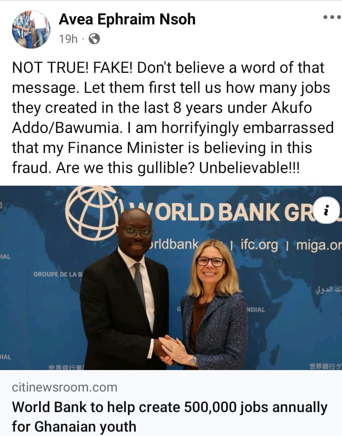 The former Upper East Regional Minister, Prof. Avea Ephraim Nsoh, has expressed his skepticism about the World Bank’s recent commitment to create 500,000 jobs annually for Ghanaian youth.