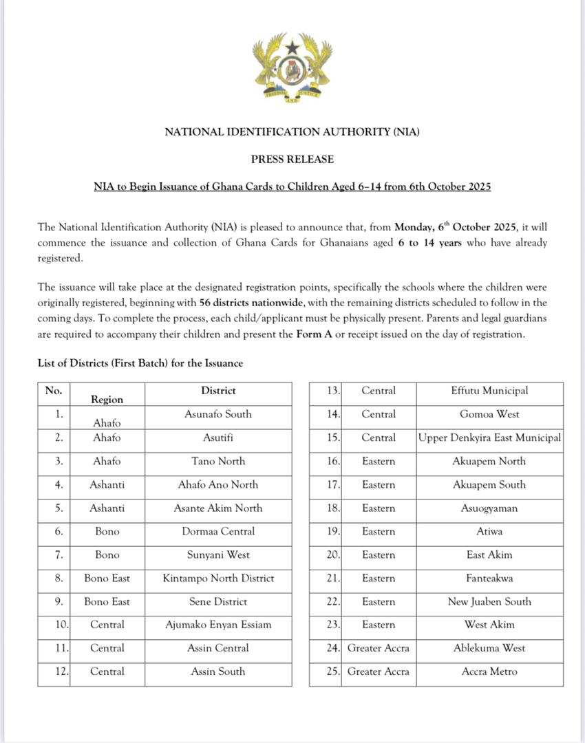 In a statement, the NIA urged all parents and guardians to cooperate fully to ensure a smooth and successful Ghana Card issuance exercise for children.