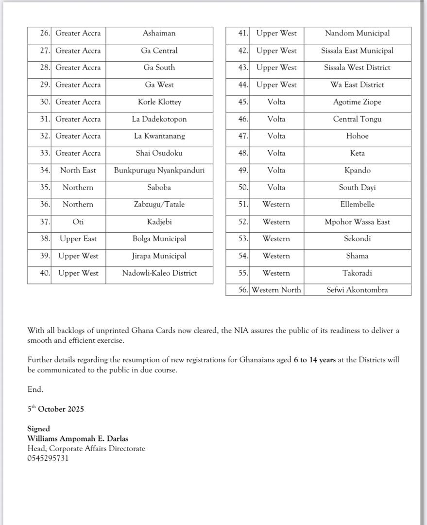 According to the NIA, the remaining districts will be served in the coming days, with the Authority assuring the public that all backlogs of unprinted Ghana Cards have been cleared. This progress paves the way for a smoother and faster issuance process for children.