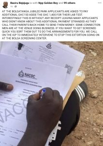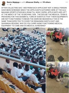 The park, turned into a screening centre, was meant to be a place of fair process. Instead, it has become a scene of financial anguish. Applicants who had already saved GHC 1,400 for mandatory lab tests are now being told, at the gate, without warning, that they must pay an additional GHC 150.