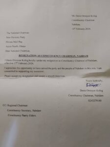 In a succinct but weighty resignation letter dated February 17, 2026, titled “Resignation as Constituency Chairman Nabdam,” Mr. Ontoyen made his decision official. “I, Denis Ontoyen Kolog, hereby tender my resignation letter as Constituency Chairman of Nabdam effective 17th February 2026,” the letter stated. While he graciously acknowledged the opportunity to serve, writing, “I appreciate the opportunity to have served the party and the people of Nabdam in this role. I am committed to supporting my successor,” the circumstances surrounding his exit tell a far more painful story.