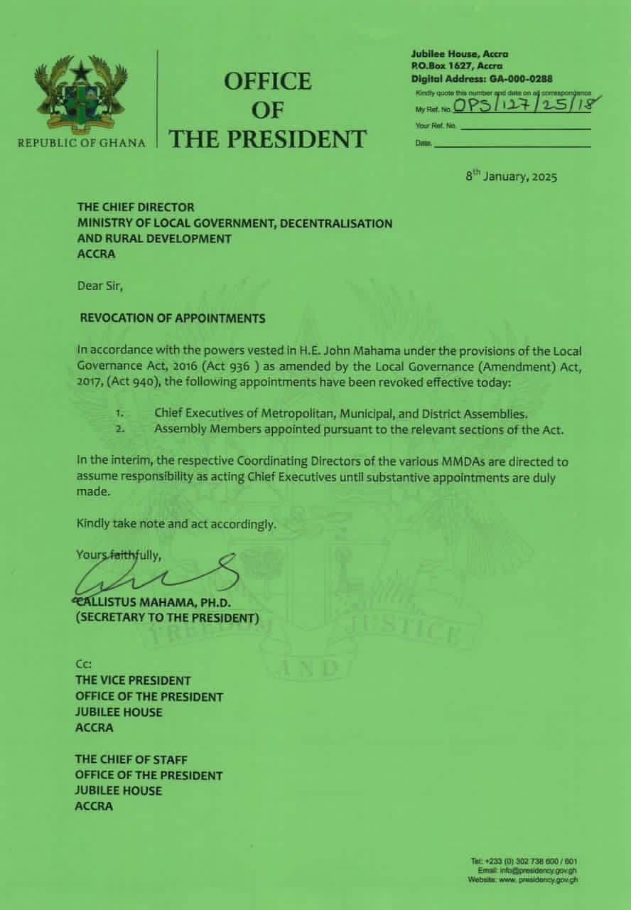 President John Dramani Mahama has revoked the appointments of chief executives of Metropolitan, Municipal, and District Assemblies (MMDAs), as well as assembly members appointed under relevant sections of the Local Governance Act. Apexnewsgh reports