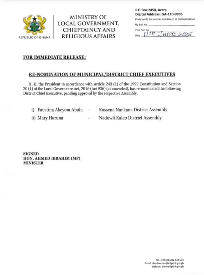 The re-nomination was announced in a statement signed and issued by the Minister for Local Government, Chieftaincy and Religious Affairs, Ahmed Ibrahim, on Wednesday, June 11, 2025.