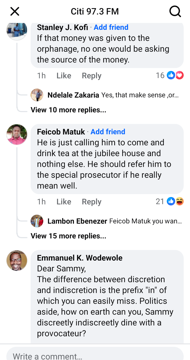 Another individual weighed in with a more pointed critique, reminding Gyamfi of the line between discretion and indiscretion, stating, “Dear Sammy, the difference between discretion and indiscretion is the prefix ‘in,’ of which you can easily miss. Politics aside, how on earth can you, Sammy, discreetly dine with a provocateur?”