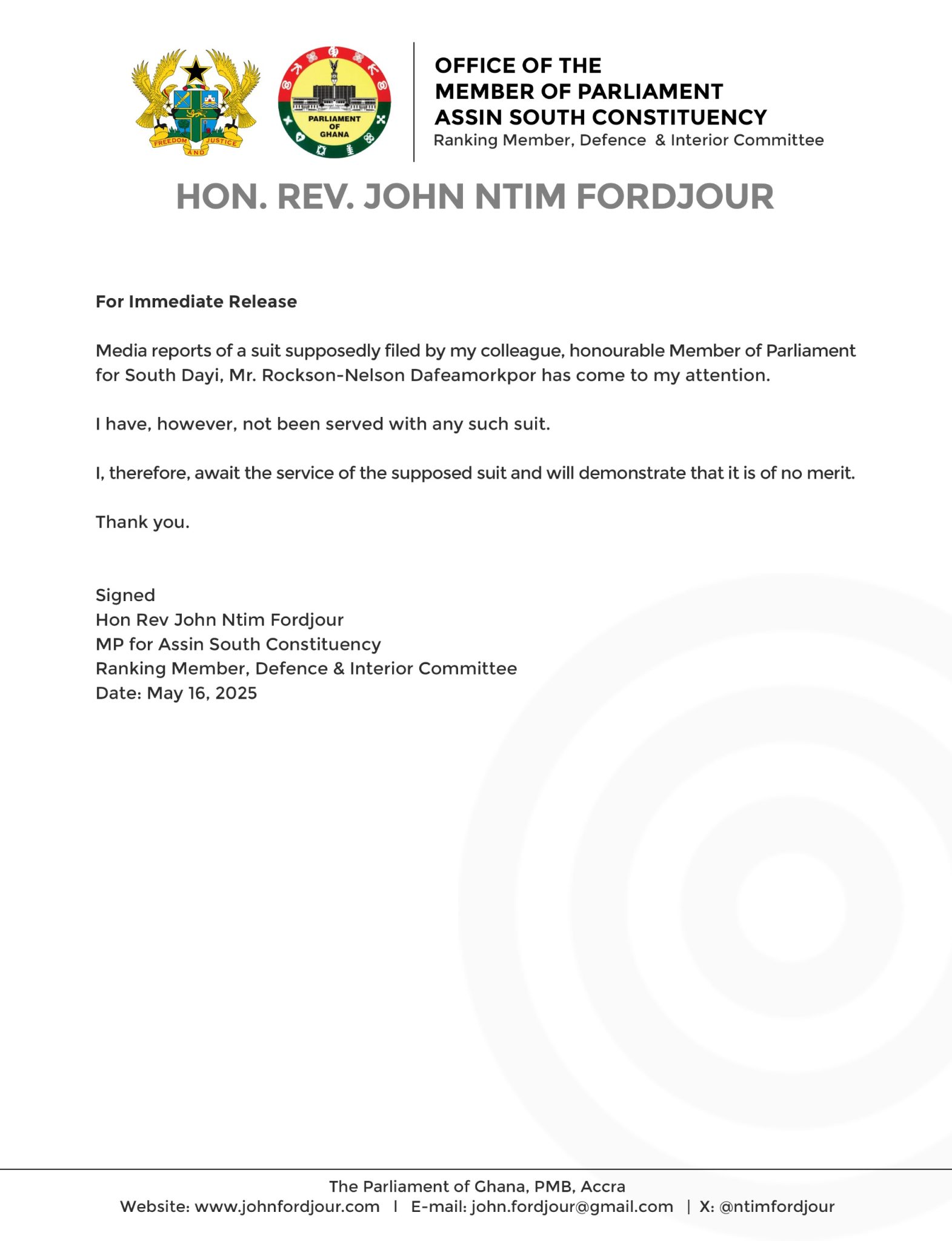 On May 16, 2025, Rev. Fordjour issued a press statement addressing the situation, emphasizing that the suit had not yet come to his attention. He expressed his readiness to be served and his confidence in demonstrating the suit’s lack of merit. “Media reports of a suit supposedly filed by my colleague Honourable Member of Parliament for South Dayi, Mr. Rockson-Nelson Dafeamekpor, have come to my attention. However, I have not been served with any such suit. I, therefore, await the service of the supposed suit and will demonstrate that it is of no merit,” he stated.